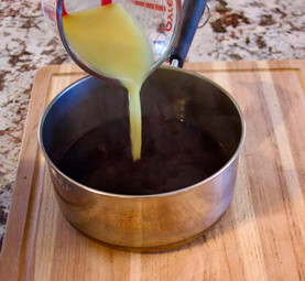 Once you have reached a good point of thickness in the Port. Strain the shallots out of the Port into another sauce pan and add a ½ cup of chicken broth. Be sure you use ½ cup and not more, or you will get a watery mixture and then you will have to start over.